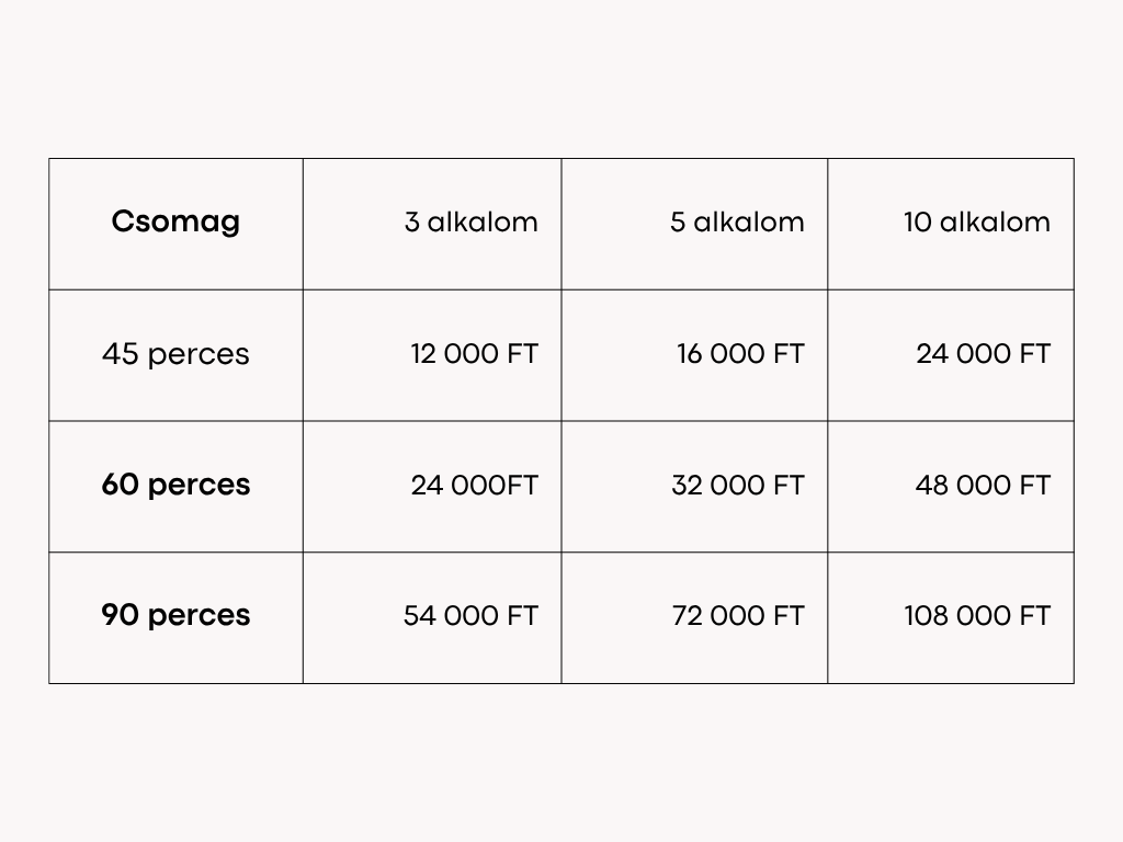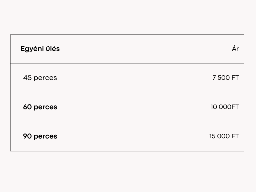 Az első konzultációs alkalom ingyenes, hogy minden kockázat nélkül kiderülhessen számodra, hogy megvan -e köztünk a szükséges összhang. Az első ülést követően a következő módokon számítandó az ülések anyagi vonzata.